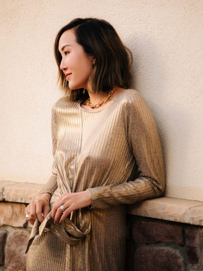 Imagine stepping into a holiday party wearing a dress that exudes both glamour and effortless charm. That’s exactly what you get with this gorgeous gold dress from the collection. Its fluid drape and adjustable tie detail in the front create a flattering silhouette that works for any body type. The shimmering metallic finish is perfect for festive events, and if you prefer something more versatile, the dress is also available in black for everyday wear. Priced at just $30, it proves that you don’t have to sacrifice style for budget. To complete the look, I paired the dress with a pair of adorable red booties that not only add a pop of color but also offer the comfort and versatility to transition from casual days to sparkling nights.